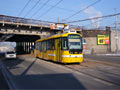 rozestavěným jižním mostem. Až bude most a okolní zdi dokončeny, budou troleje převěšeny a druhá kolej zprovozněna. S pokračujícími pracemi na novém jižním mostě jsou