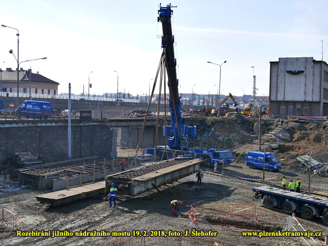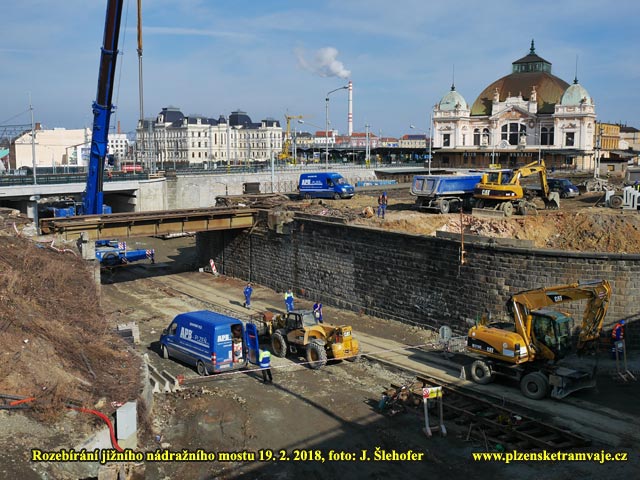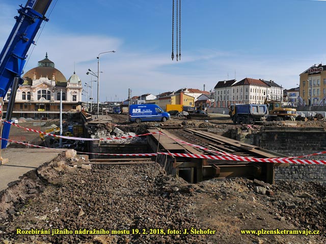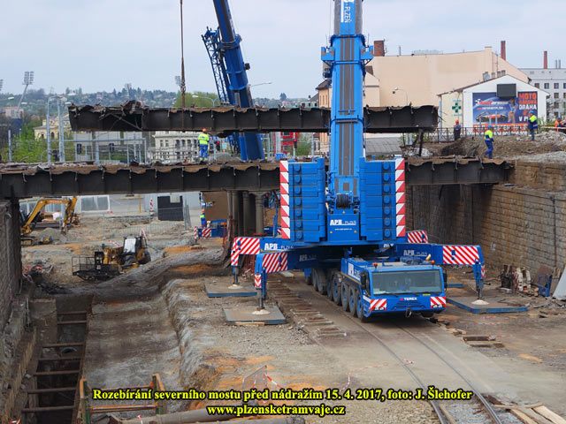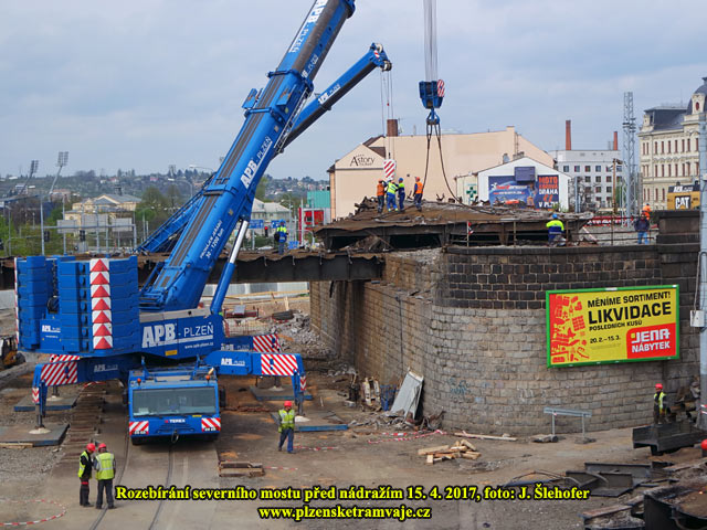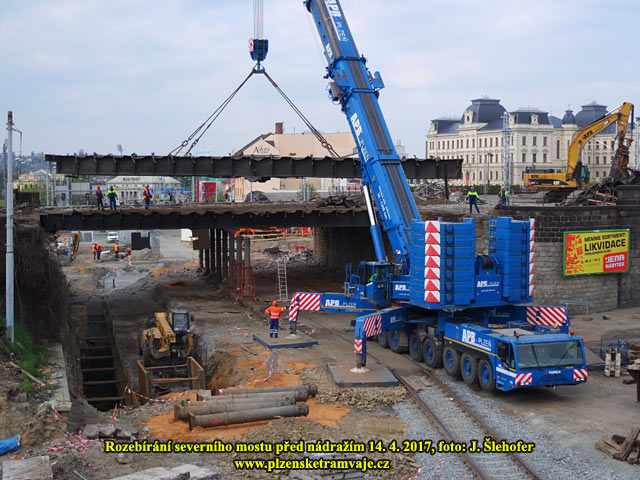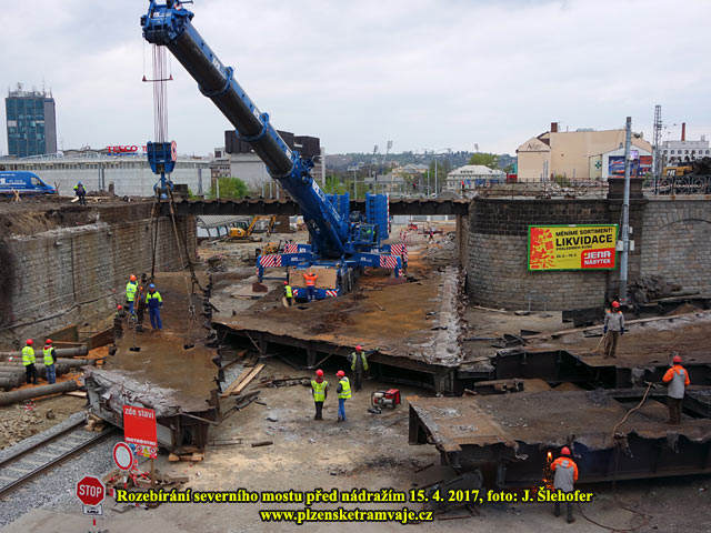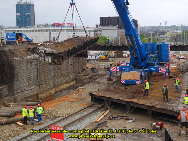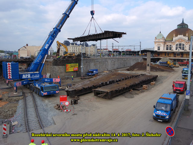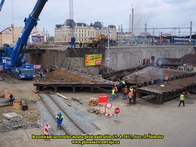 rozebírání severního mostu před nádražím. Již v předchozích týdnech byl ze severního mostu odkloněn železniční provoz, rozebráno trolejové vedení i železniční trať.