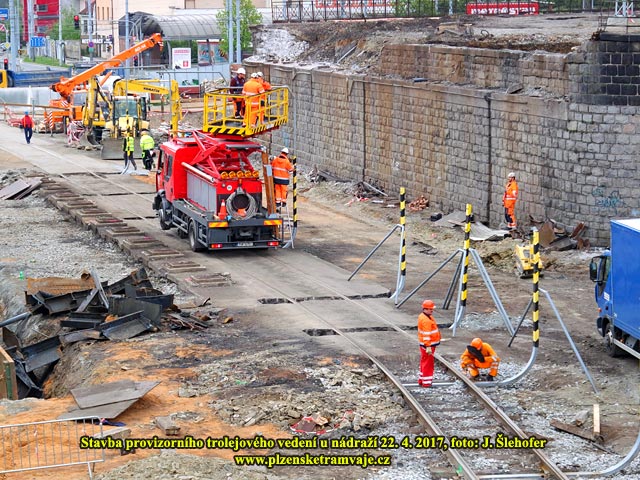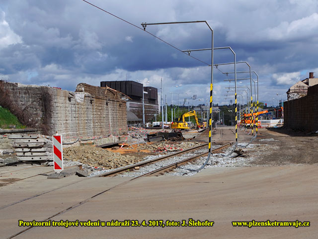 ještě více. Provizorní sloupy již byly odstraněny a trolejové vedení je převěšeno na nové definitivní.