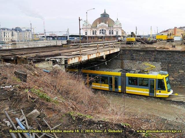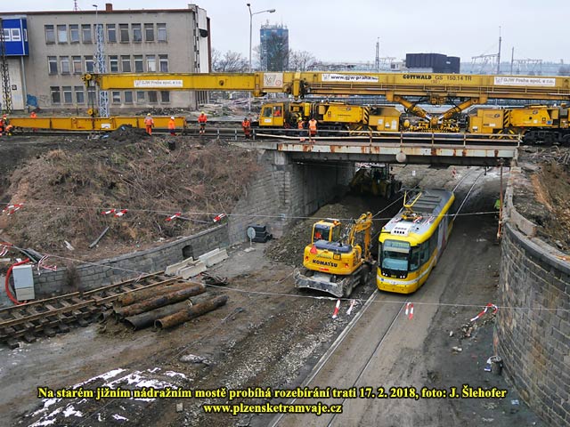 Tramvajová výluka pod železničními mosty v Mikulášské ulici je naplánována od 19. 2. do 26. 2. 2018 a během ní bude snesen jižní železniční most.