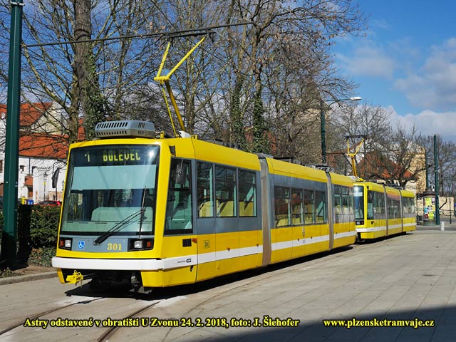 Dvě Astry pro linku č. 1 stály o víkendu také v obratišti U Zvonu. Záložní soupravy parkovaly v obratištích Mozartova a Malesická.