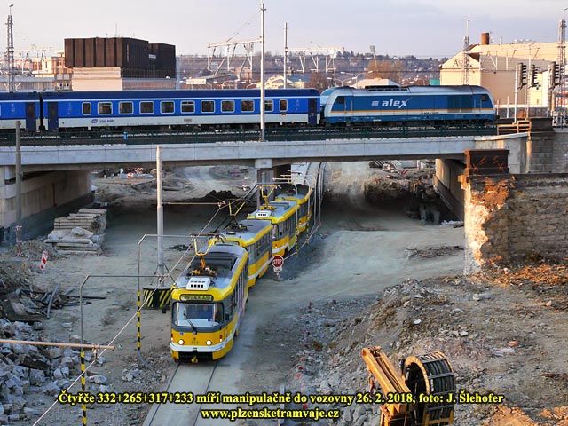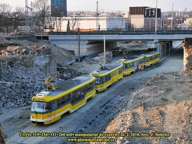 V podvečer posledního dne výluky, tedy v pondělí 26. 2. 2018 byl již umožněn návrat tramvají do vozovny. Zatahující šejdrové soupravy tak již projížděli staveništěm.