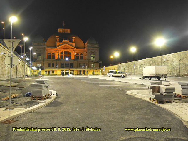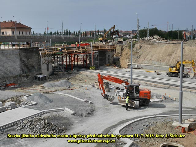 Jižní železniční most již stojí a tak se během srpna u nádraží pokračuje s instalací obrubníků a následně dokončování povrchů. Zejména za jižním mostem na Mikulášské třídě je práce