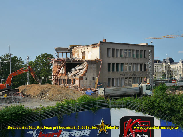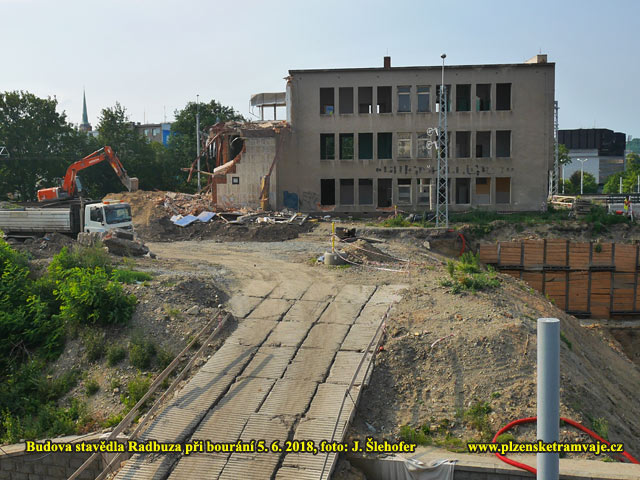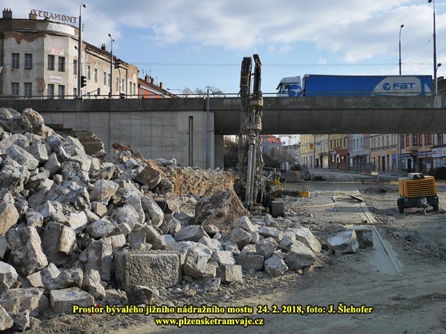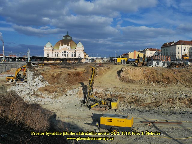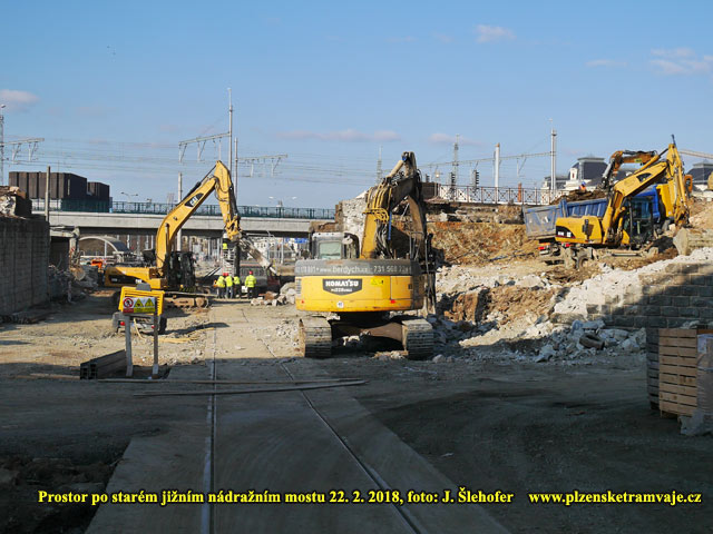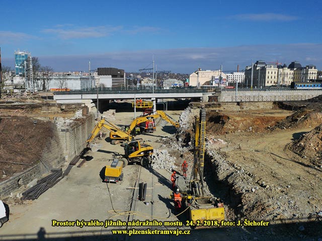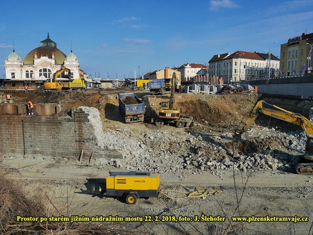 je již rozebírána. Na stavbě jsou již patrné budoucí pilíře nového železničního mostu a také červený zárodek krycí konstrukce nad tramvajovou tratí, která bude stavěna