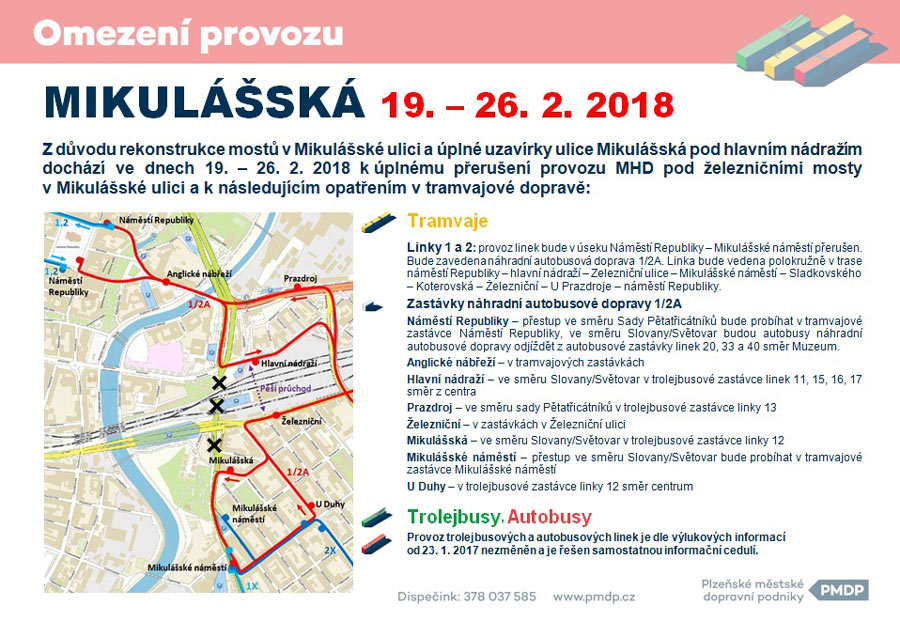 Provoz MHD je organizován jako při předchozích výlukách. Linky 1 a 2 od Bolevce opět končí na náměstí Republiky, odkud cestující pokračují na Mikulášské