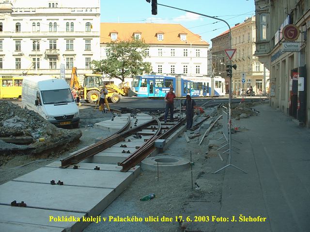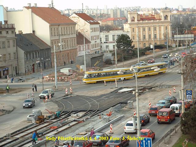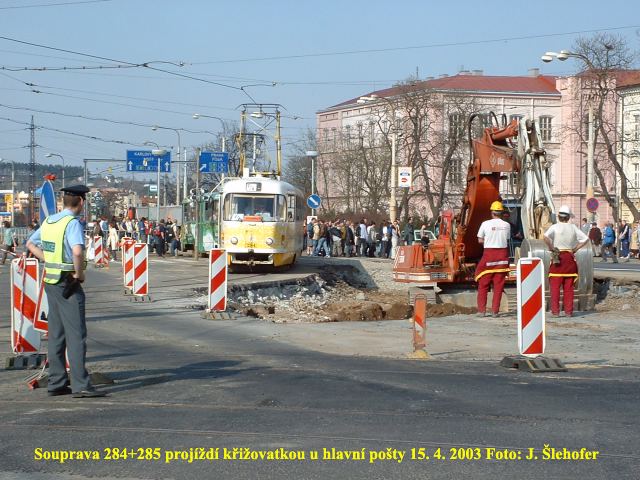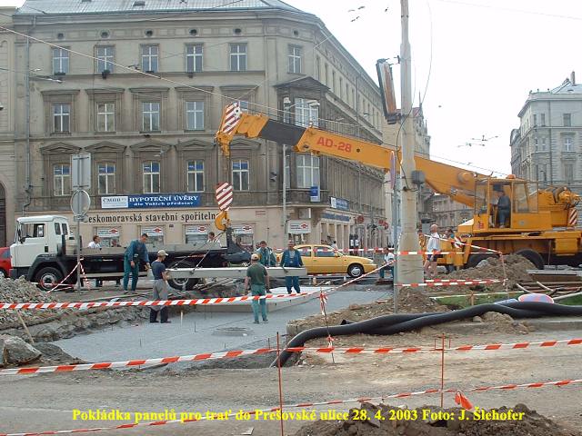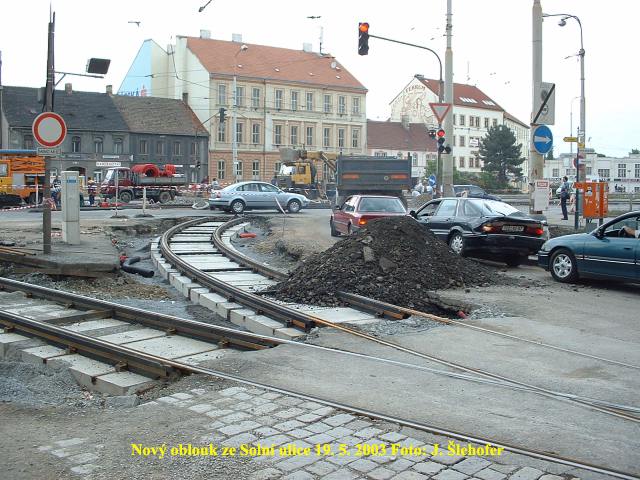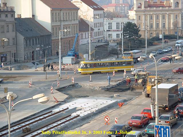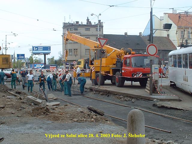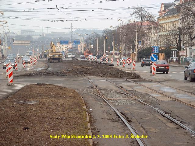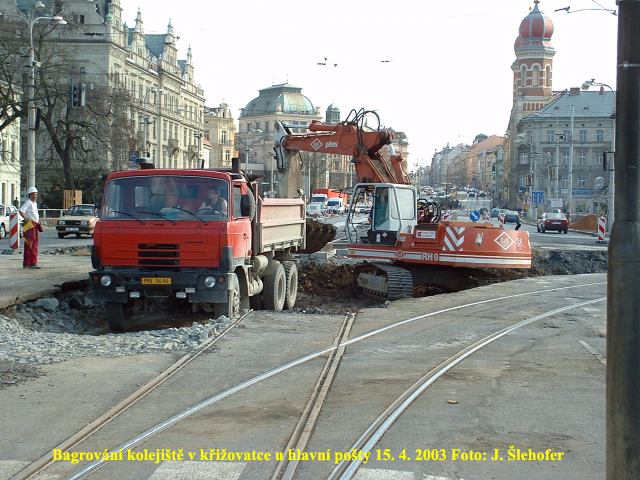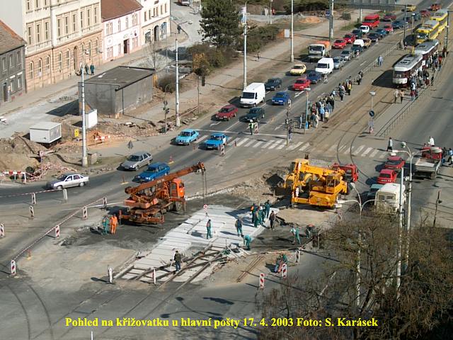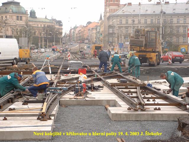 Ve čtvrtek 3. 4. 2003 je již kus nového kolejiště v křižovatce u hlavní pošty částečně zaasfaltováno.