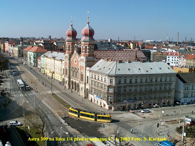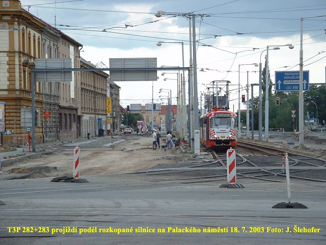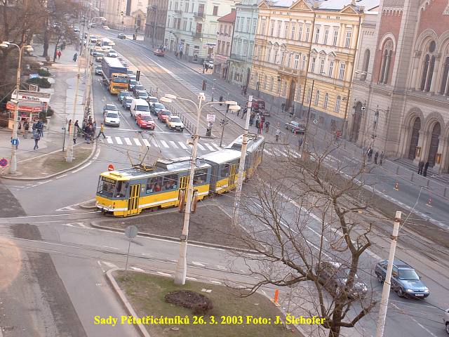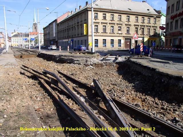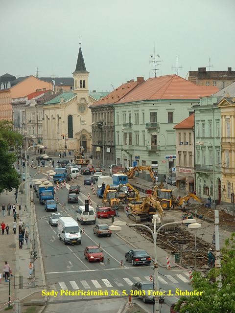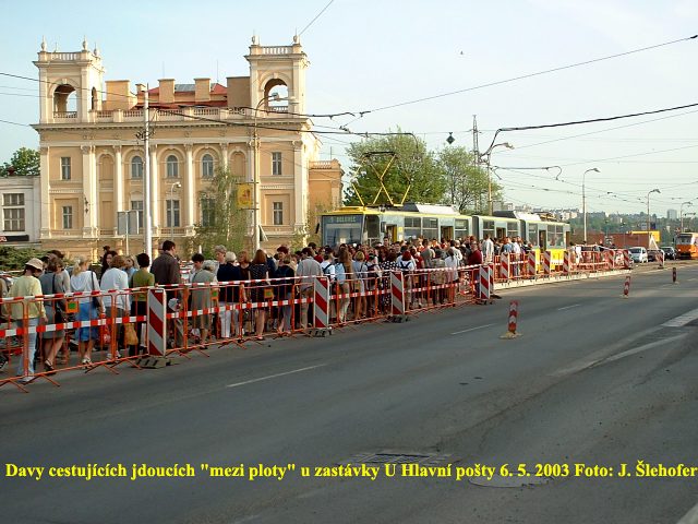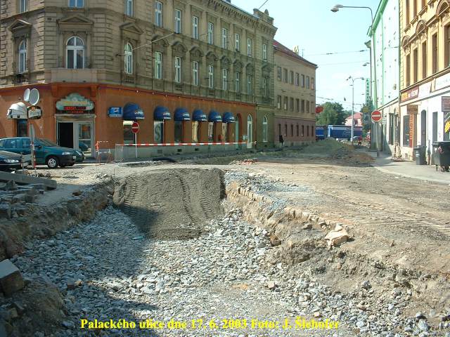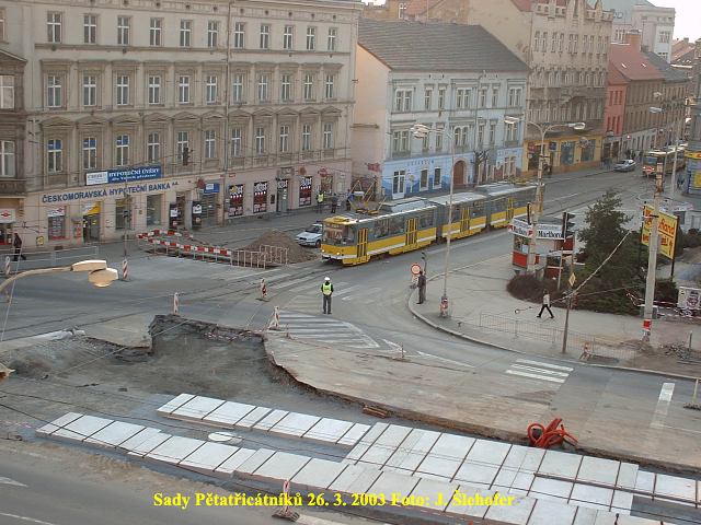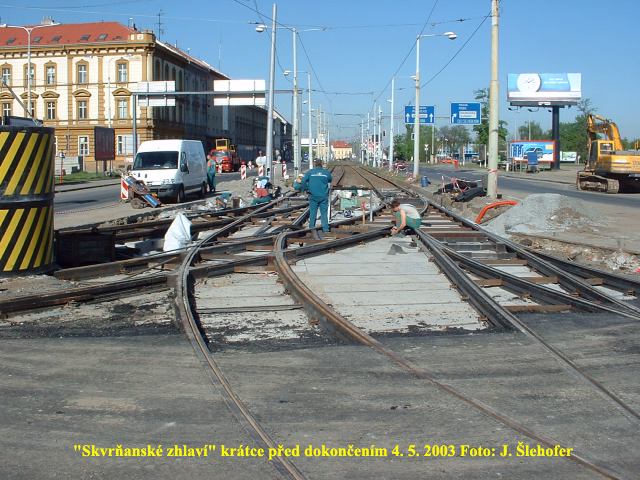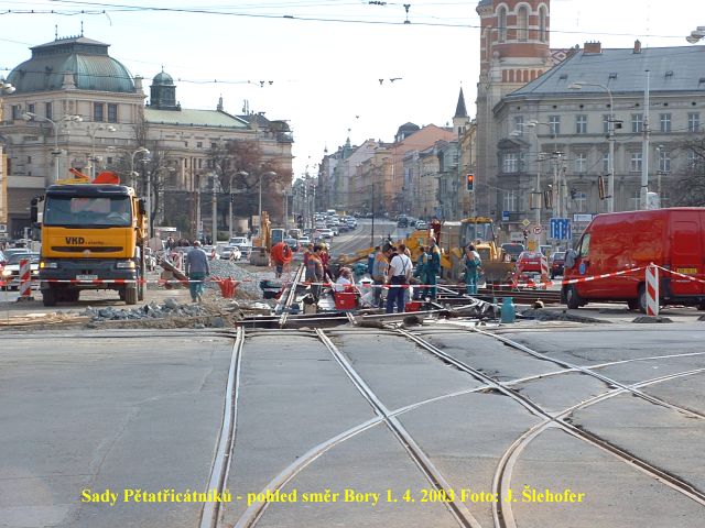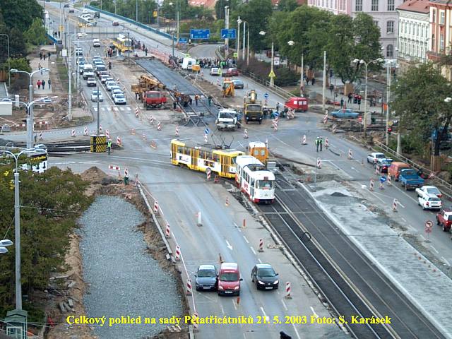 Ve čtvrtek 3. 4. 2003 je již kus nového kolejiště v křižovatce u hlavní pošty částečně zaasfaltováno.