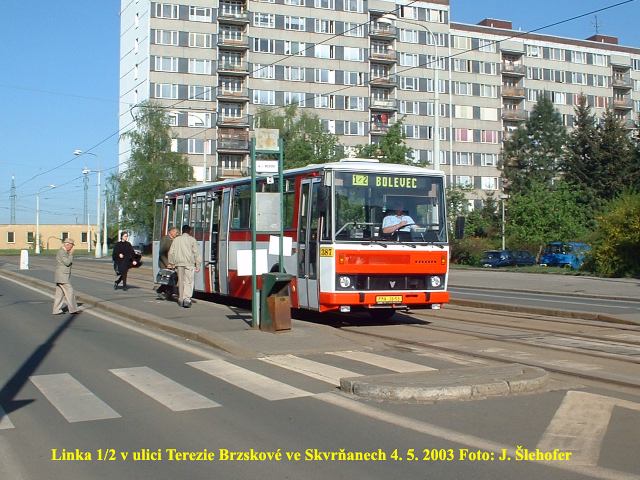 na Košutku. Linka 1/2 vedla ze Skvrňan v trase tramvaje a ž ke III. bráně, odkud pokračovala Tylovou ulicí,