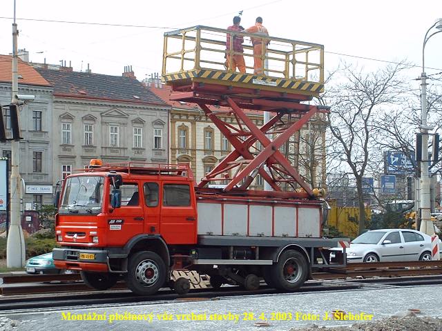 Pracovníci horního vedení již provádí montáž trolejí za pomoci plošinového vozu s kolejovou redukcí.