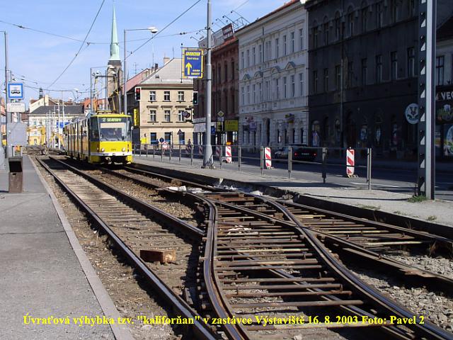 vyhybky za zastávkou výstaviště a následujícího kolejiště přes křižovatku Jízdecká - Palackého. Byla zde