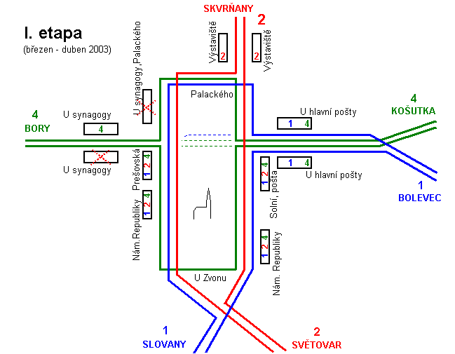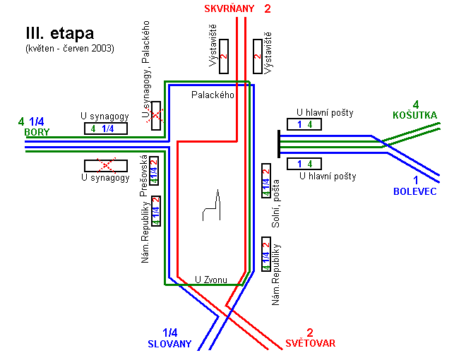 Při třetí etapě bude již po části nového kolejiště vedena linka č. 2. Třetí etapa začně v pondělí 5. 5. 2003,