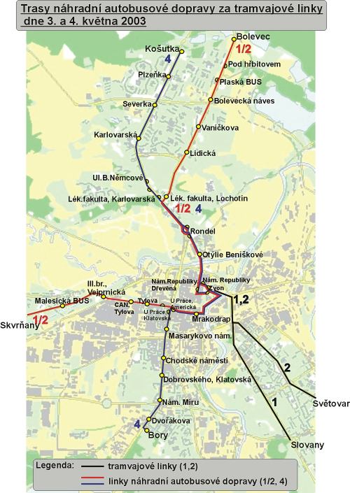 Pětatřicátníků. Ve směru z Bor na Košutku jela linka č. 4 přes náměstí Republiky a Zvon a v opačném směru