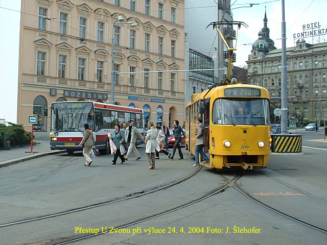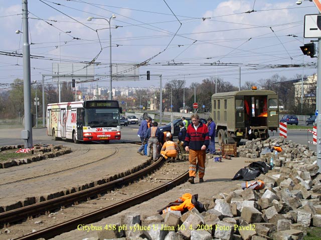 V sobotu 10. 4. 2004 probíhala první z výluk na tramvajových linkách č. 1 a 2 z důvodu výměny kolejí v oblouku na křižovatce U prazdroje -