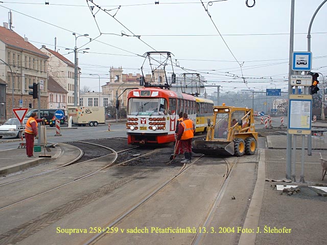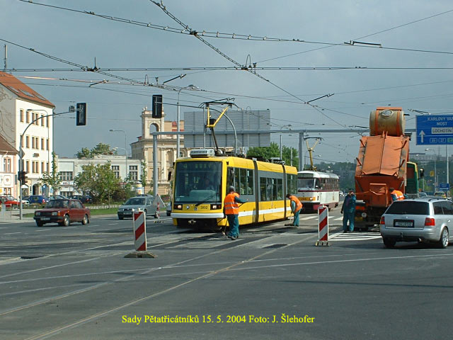 Elektrotechnickou fakultou, tedy v místě budoucího zastávkového zálivu pro autobusy. Na fotografii je souprava 206+207 (po velké prohlídce - do nedávna největší vrak) v zastávce Sady Pětatřicátníků.