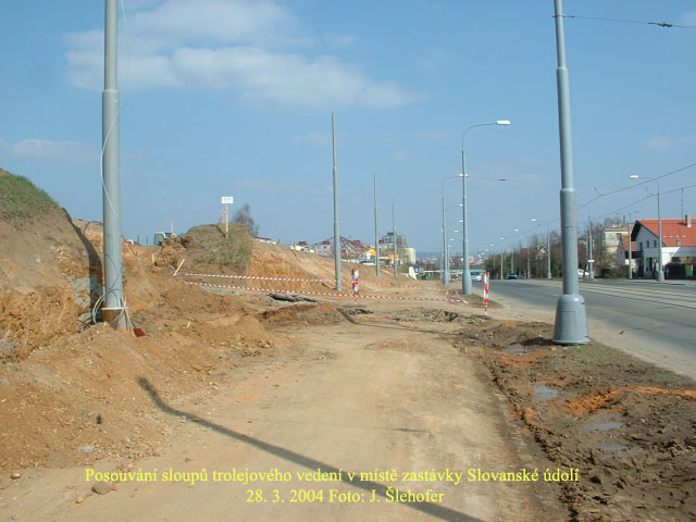 trolejové vedení. Převěšeno na nové sloupy bylo v noci z neděle 28. 3. 2004 na pondělí 29. 3. 2004.