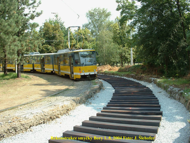 Současně probíhají i úpravy smyčky Bory. Zde budou postupně měněny oba kolejové oblouky.