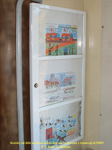 Celý měsíc září jsou v tramvajích KT8D5 vystavené kresby od dětí na téma město bez aut a ekologická doprava.