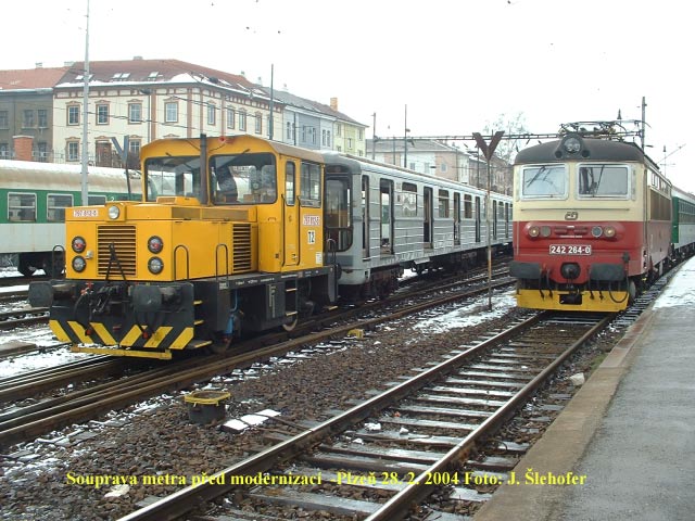 po vlastní ose po železnici do, nebo ze Škodovky, kde jsou prováděny jejich modernizace. Na fotografii vpravo je jedna ze souprav ve stavu v jakém přicházejí z Prahy.
