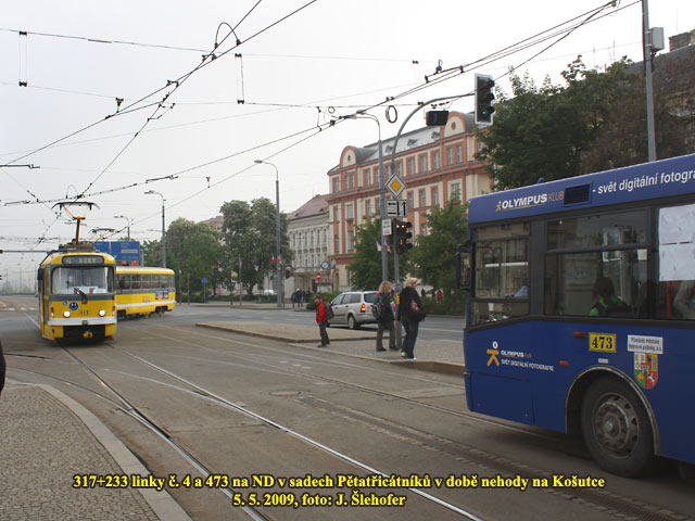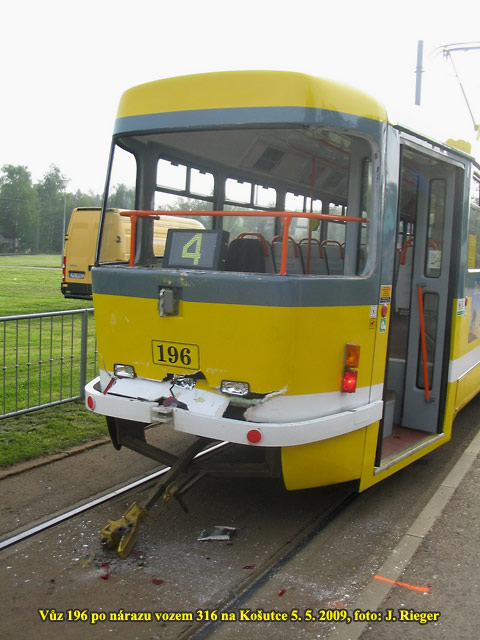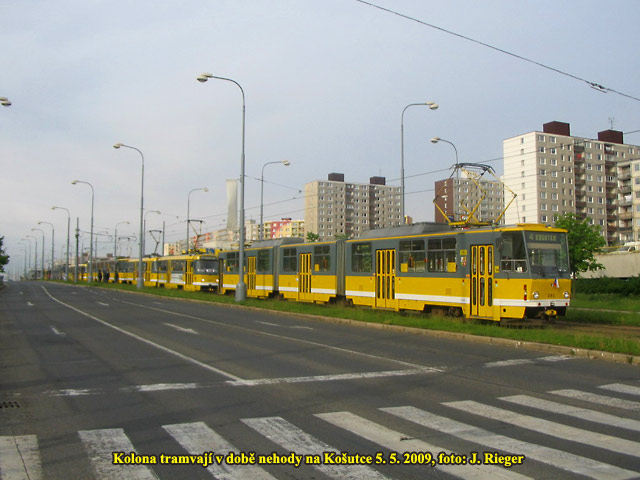 Nakolejování vozu č. 317 na Košutce 5. 5. 2009, foto: K. Růžička Poškozený vůz č. 196 po nárazu vozem č. 317 na Košutce 5. 5. 2009, foto: J. Rieger Dlouhá Kolona tramvají v zastávce Plzeňka v době nehody na Košutce 5. 5. 2009, foto: J. Rieger Dlouhá Kolona tramvají v době nehody na Košutce 5. 5. 2009, foto: J. Rieger