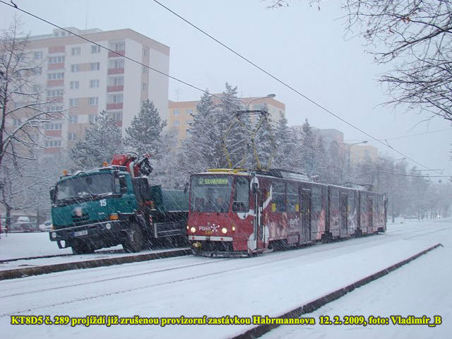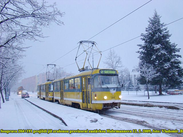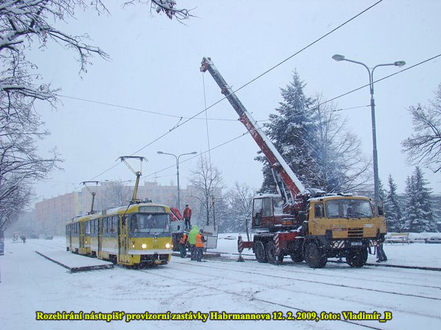 Souprava 262+263 v nové zastávce Habrmannova 12. 2. 2009, foto: Vladimír_B Souprava 204+191 projíždí již zrušenou dočasnou zastávkou Habrmannova 12. 2. 2009, foto: Vladimír_B KT8D5 č. 298 projíždí již zrušenou dočasnou zastávkou Habrmannova 12. 2. 2009, foto: Vladimír_B Rozebírání panelových nástuopišť přesunuté zastávky Habrmannova 12. 2. 2009, foto: Vladimír_B