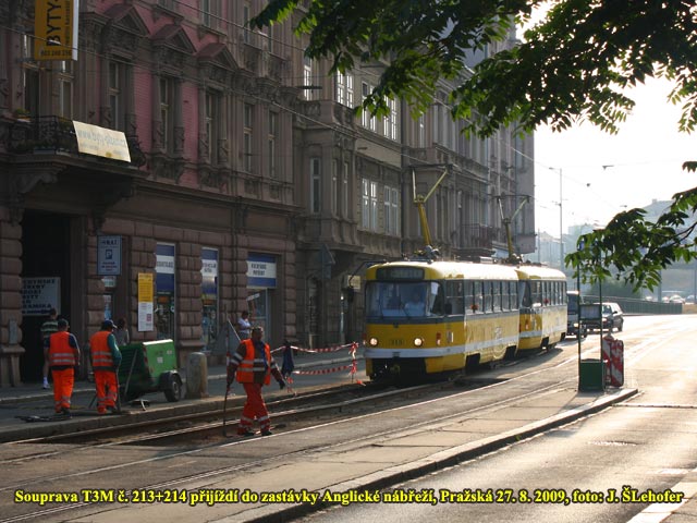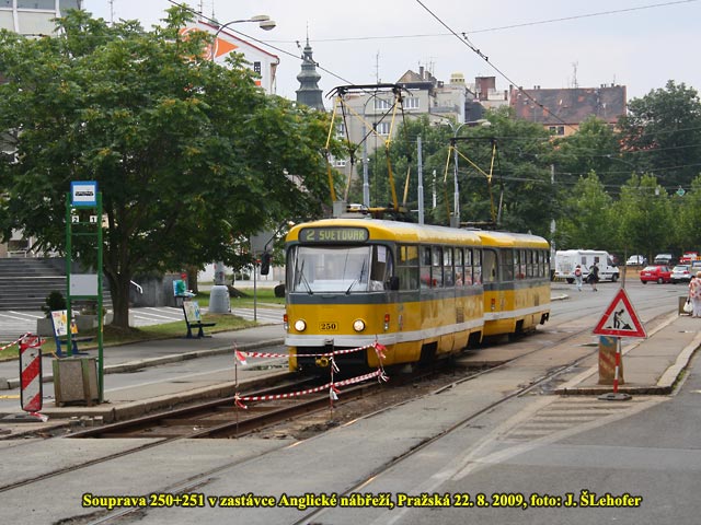 I po tomhle se dá jezdit a cestující měli příležitost i 19. 8. 2009 Souprava 250+251 v zastávce Anglické nábřeží, Pražská na opraveném úseku 22. 8. 2009 Souprava 213+214 přijíždí do zastávky Anglické nábřeží, Pražská na opraveném úseku 27. 8. 2009 Astra č. 303 přijíždí do zastávky Anglické nábřeží, Pražská před výměnou úseku druhé koleje 27. 8. 2009