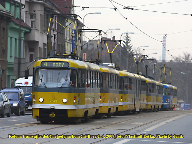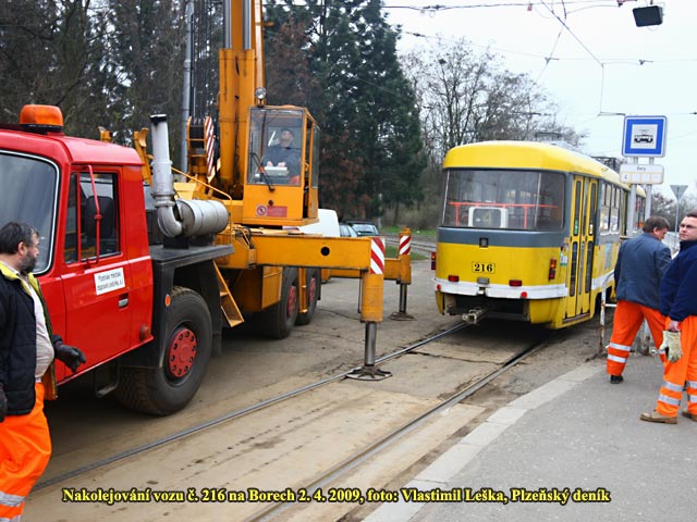 Ve čtvrtek 2. 4. 2009 pak došlo kolem osmé hodiny k vykolejení tramvaje na konečné Bory. Zadní vůz soupravy 215+216 jel na Kolona tramvají vzniklá v době nehody na Borech 2. 4. 2009, foto: Vlastimil Leška, Plzeňský deník Nakolejování vozu T3M č. 216 na Borech 2. 4. 2009, foto: Vlastimil Leška, Plzeňský deník vyhybce každým podvozkem na jinou kolej. První podvozek zadního vozu následoval první vůz soupravy do velkého oblouku, druhý podovozek zadního vozu však odbočil do malého oblouku. Na místě nakolejoval vůz jeřáb. Po dobu odstraňování nehody zajišťovaly cca hodinu náhradní dopravu autobusy.