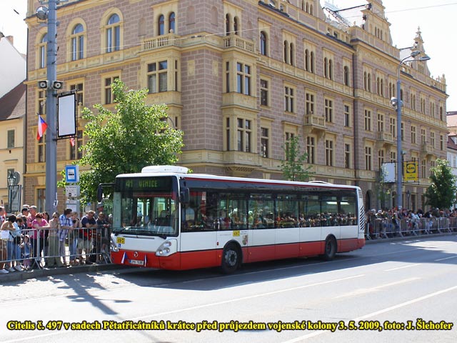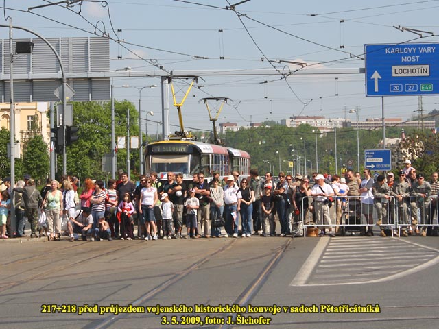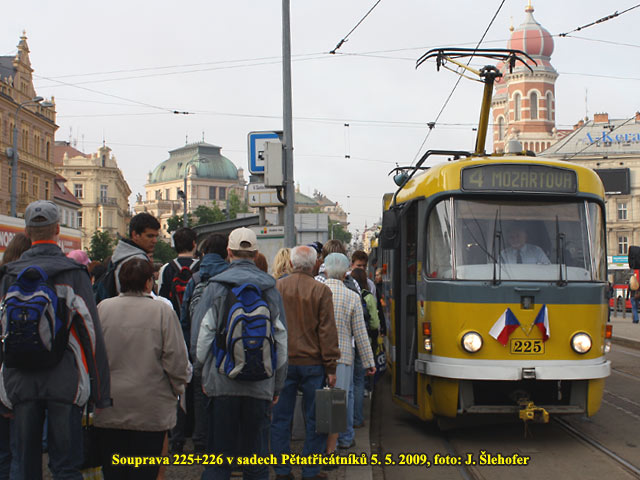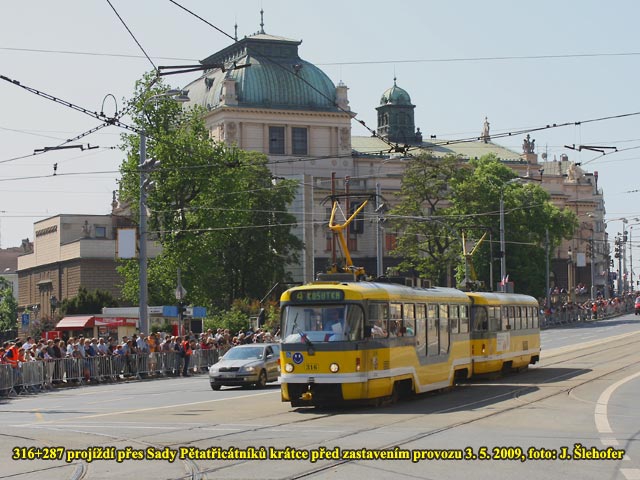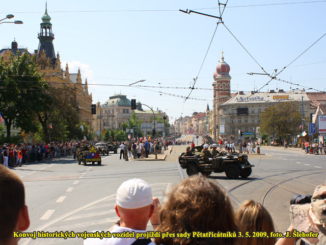 Souprava 316+287 projíždí sady Pětatřicátníků krátce před průjezdem konvoje vojenských historických vozidel 3. 5. 2009 Souprava 205+195 projíždí sady Pětatřicátníků 3. 5. 2009 Souprava 205+195 projíždí s obtížemi v 11:07 sady Pětatřicátníků 3. 5. 2009 Citelis č. 497 stanicuje v již ohrazené zastávce v sadech Pětatřicátníků 3. 5. 2009 Souprava 217+218 zůstala před křižovatkou v sadech Pětatřicátníků 3. 5. 2009 Konvoj historických vojenských vozidel projíždí přes sady Pětatřicátníků 3. 5. 2009 Citybus č. 458 nasazen na náhradní dopravě za tramvaj se sune v koloně k rondelu 3. 5. 2009 KT8D5-RN2P č. 299 se otáčí U Zvonu 3. 5. 2009