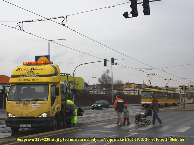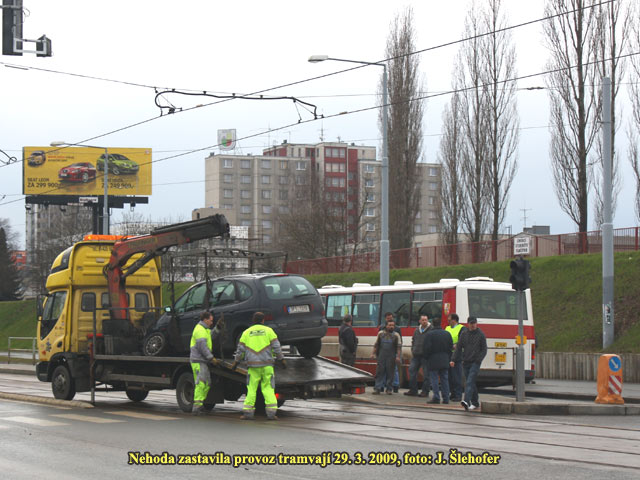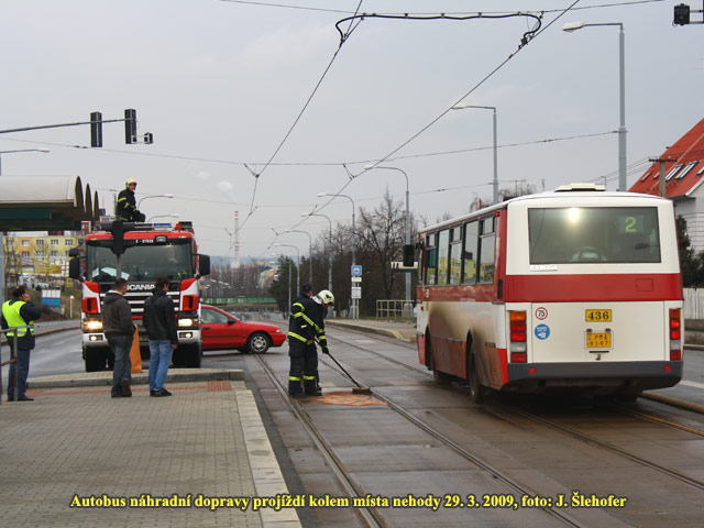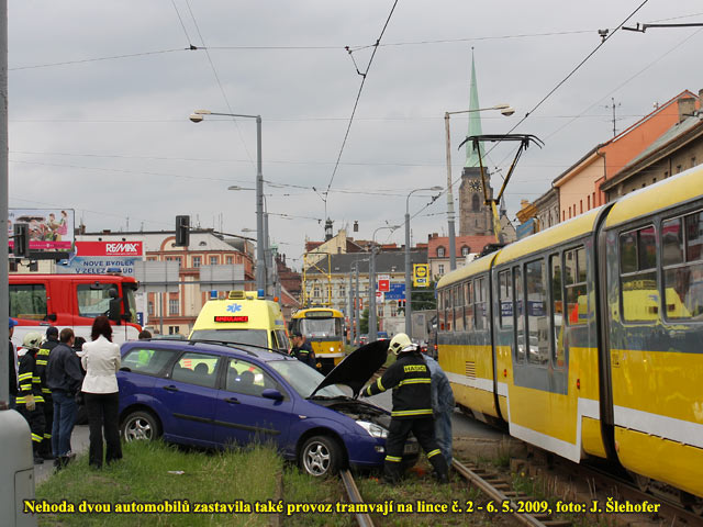 Běžně až několik drobných nehod týdně, mnohdy i denně, ovlivňuje pravidelnost tramvajového provozu. Na následujích snímcích se podíváme na dvě. V neděli 29. 3. 2009 zastavila tramvajový provoz nehoda osobního vozu, který zůstal nepohyblivý na kolejišti u zastávky Slovanské údolí. Tramvajový provoz do Skvrňan byl zastaven a vozy linky č. 2 se otáčely v obratišti Malesická. Do Skvrňany vyjely autobusy náhradní dopravy.