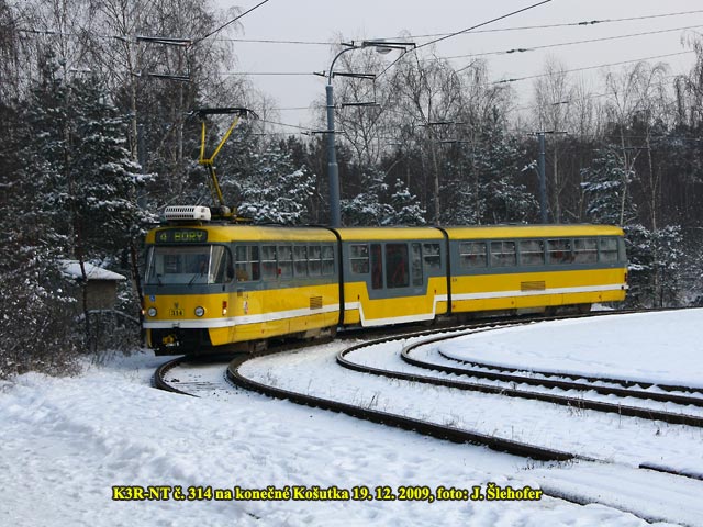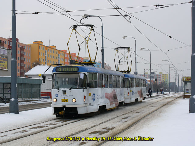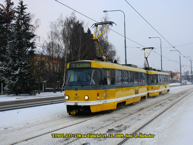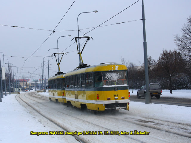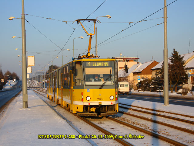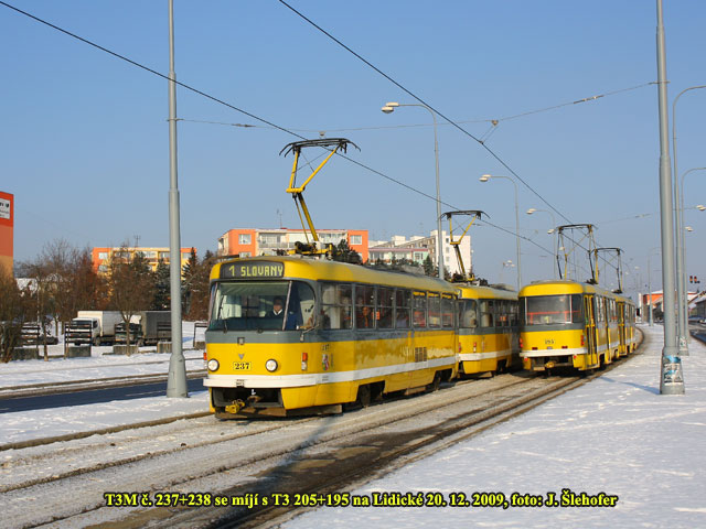 T3 205+195 ve Sladkovského 19. 12. 2009 Souprava 270+271 u Plzeňky 19. 12. 2009 T3M č. 213+214 na Košutce 19. 12. 2009 T3M č. 221+222 v zastávce Mozartova 19. 12. 2009 Souprava 258+259 v zastávce Lékařská fakulta, Karlovarská 19. 12. 2009 Souprava 264+261 stoupá po Lidické 19. 12. 2009 KT8D5-RN2P č. 288 přijíždí Lidickou k lékařské fakultě 19. 12. 2009 KT8D5-RN2P č. 297 v zastávce Sokolovská 19. 12. 2009 Souprava 262+263 přijíždí do Skvrňan 19. 12. 2009 327+256 ve Sladkovského 19. 12. 2009 K3R-NT č. 313 přijíždí na Košutku 19. 12. 2009 K3R-NT č. 314 na Košutce 19. 12. 2009 T3M č. 237+238 na Lidické 19. 12. 2009 Souprava 315+286 na Lidické 20. 12. 2009 T3M č. 237+238 se míjí s T3 č. 205+195 na Lidické 20. 12. 2009 KT8D5-RN2P č. 288 na Plaské 20. 12. 2009