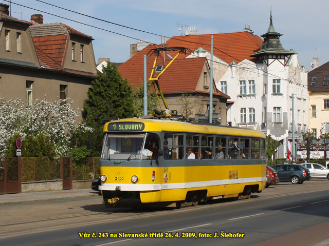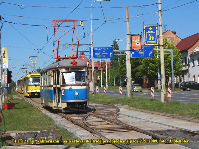Souprava 211+212 na kaliforňanu na Karlovarské třídě 30. 4. 2009 K3R-NT č. 311 netypicky nasazena na lince č. 1 projíždí jednokolejkou na Karlovarské třídě 30. 4. 2009 Souprava 260+265 projíždí zrušenou zastávkou Pod Záhorskem 30. 4. 2009 Souprava 323+324 zdolává kaliforňan na Karlovarské třídě 30. 4. 2009