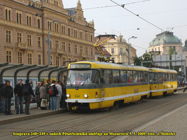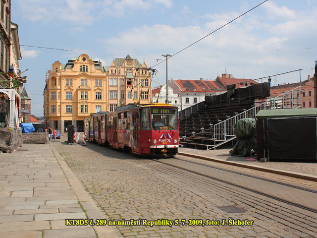 Souprava 264+261 na náměstí Republiky nasazana na lince 1/4 při výluce 5. 7. 2009 O prodlouženém prvním červencovém víkendu probíhala opět výluka ve stejném rozsahu, tj. tramvajový provoz 1/4 Slovany - Bory a z náměstí Republiky na Košutku a do Bolevce autobusy náhradní dopravy. Výluka začala již v pátek 3. 7. 2009 v devatenáct hodin a pokračovala až do pondělního (státní svátek) večera (6. 7. 2009).