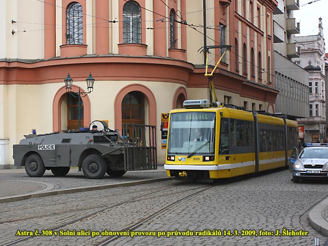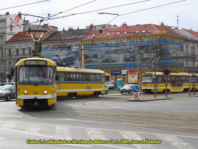 Soupravy linky č. 2 pokračují od Skvrňan do Bolevce 14. 3. 2009 Sólo linky č. 1 přesměrované do Skvrňan 14. 3. 2009 Astra 308 po obnovení provozu projíždí kolem OT v Solní ulici 14. 3. 2009 Vůz č. 278 po obnovení provozu projíždí kolem OT v Solní ulici 14. 3. 2009