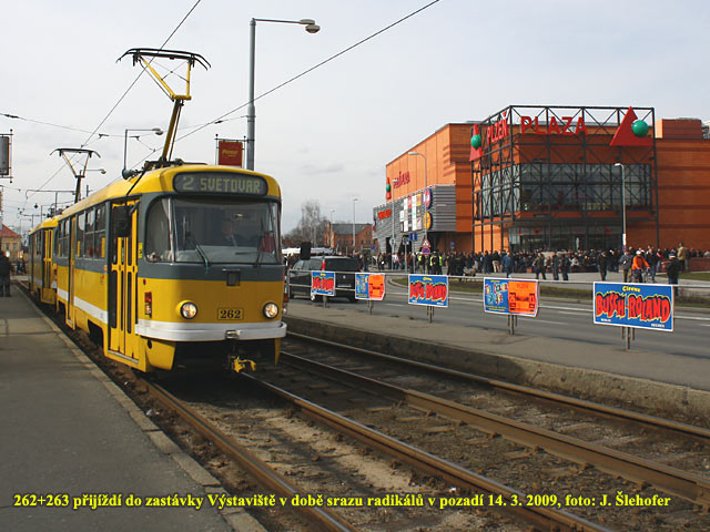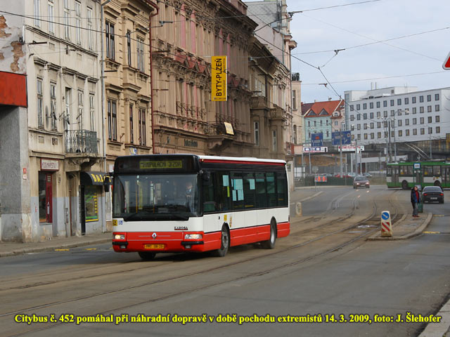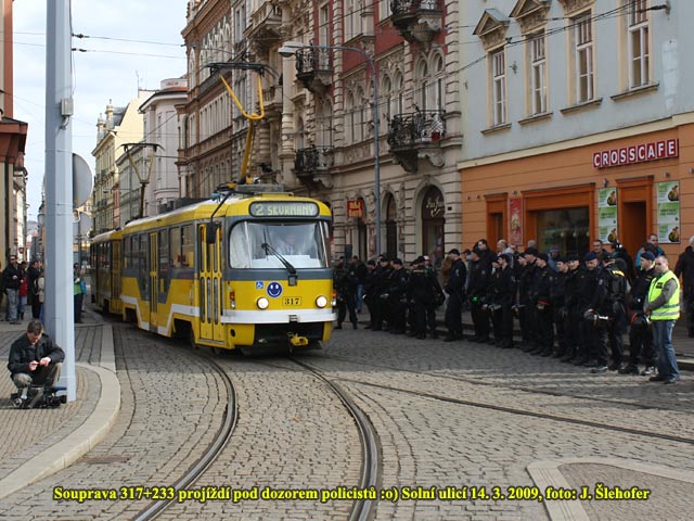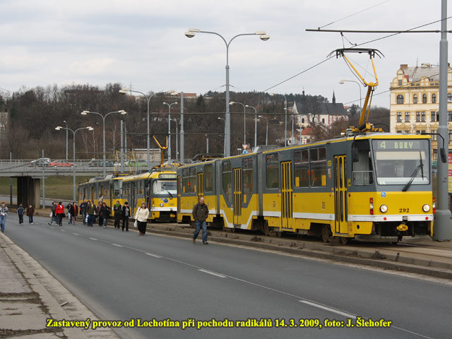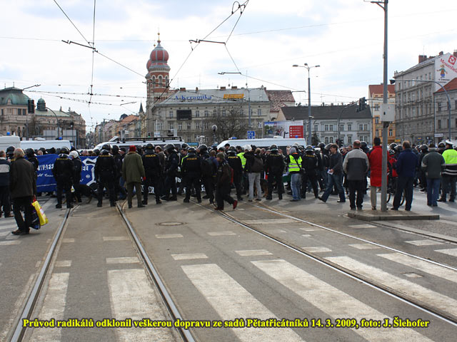 Souprava 262+263 přijíždí do zastávky Výstaviště v době srazu ultrapravice o obchodního centra Plaza - v pozadí 14. 3. 2009 Souprava 317+233 v Solní ulici, kde se již Policie připravuje na průchod průvodu 14. 3. 2009 Průvod ultrapravice respektive akce „Protest proti sionismu“ byla ohlášena od třinácti hodin u obchodního domu Plaza. Trasa průvodu vedla na náměstí Republiky. Již od dopoledních hodin bylo možné v centru Plzně vidět četné policejní hlídky. Samotný průvod pak vyrazil od Plazy nakonec s hodinovým zpožděním. To již byla uzavřena veškerá doprava v sadech Pětatřicátníků. Tramvaje se Zastavené tramvaje od Lochotína v době průchodů ultrapravice přes centrum 14. 3. 2009 Průvod ultrapravice prochází kordonem přes sady Pětatřicátníků, veškerá doprava je odkloněna 14. 3. 2009 zastavily krátce po druhé hodině. Policie vytvořila kordon do Solní ulice pro účastníky pochodu a oddělovala tak jejich odpůrce, kterých se zde sešlo značně více než účastníků pochodu. Když průvod prošel na náměstí Republiky, bylo policií pro všechny uzavřeno historické centrum města. Po půl třetí se do sadů Pětatřicátníků vrátila doprava.