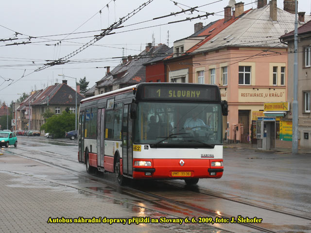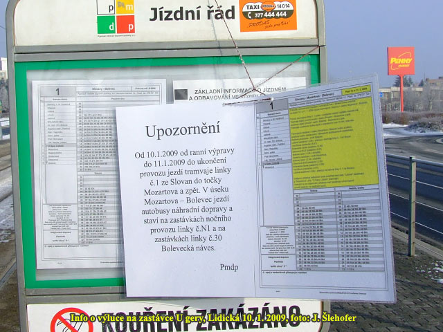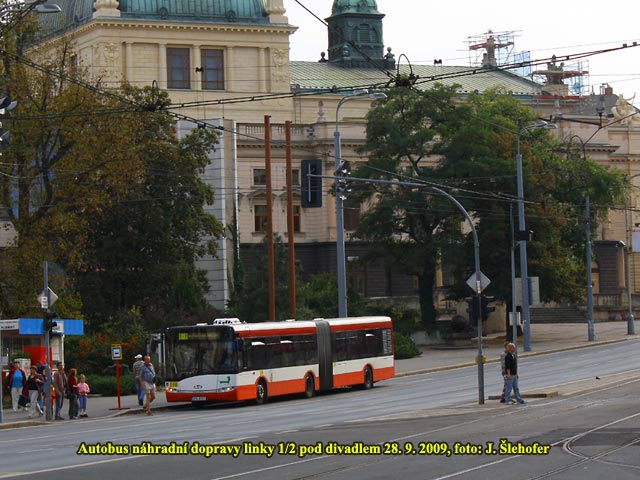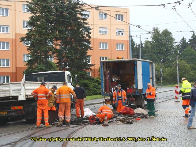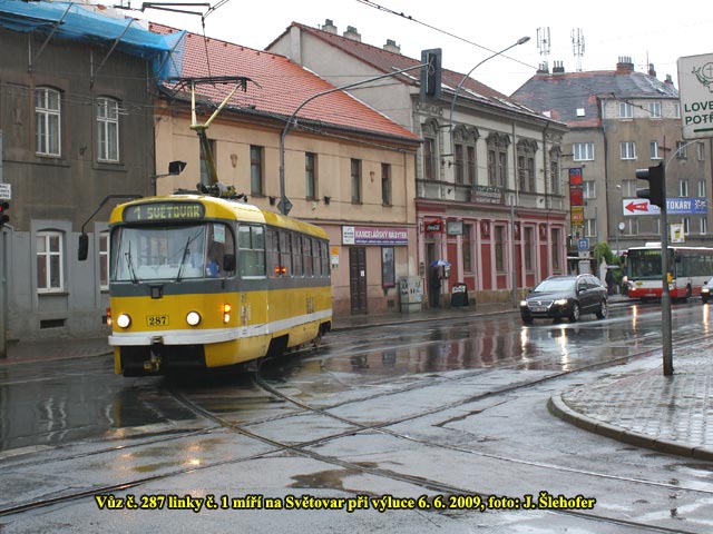 Vůz č. 287 linky č. 1 je odkloněn na Světovar při výluce 6. 6. 2009 Astra č. 305 projíždí Slovanskou alejí kolem vozovny při výluce 6. 6. 2009 Výměna vyhybky na náměstí Milady Horákové 6. 6. 2009 Citybus č. 462 jako náhradní doprava za tramvaj linky č. 1 přijíždí na Slovany 6. 6. 2009
