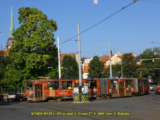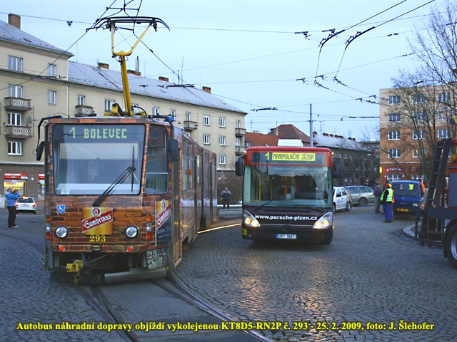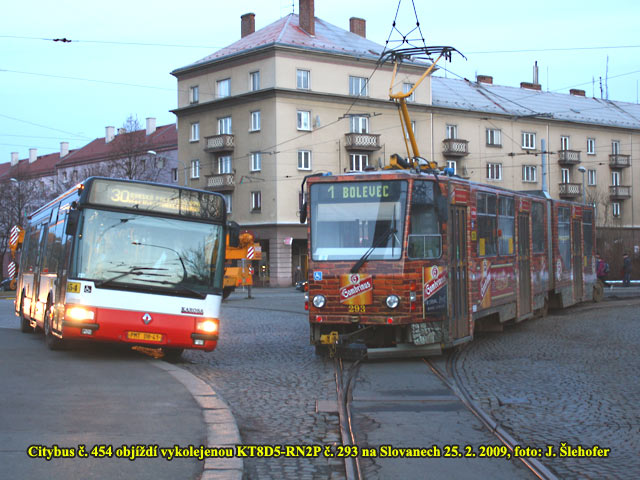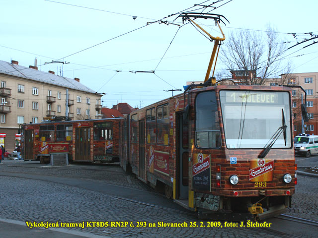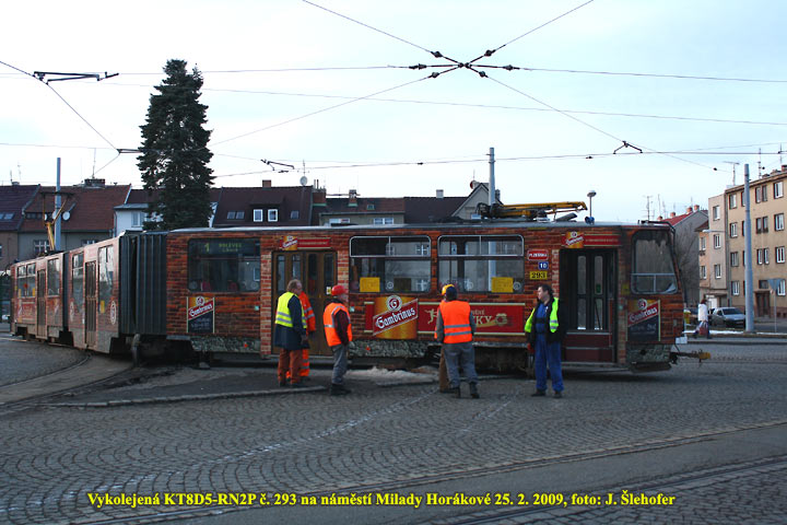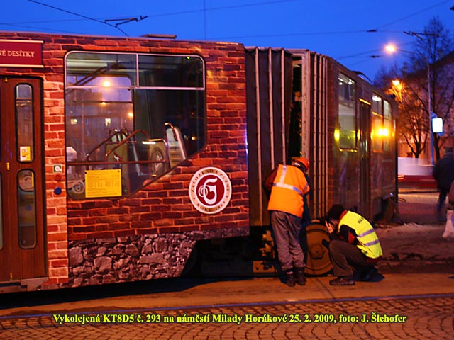 Ve středu 25. 2. 2009 na náměstí Milady Horákové vykolejil kolem sedmnácté hodiny vůz KT8D5-RN2P č. 293. K nehodě došlo na Citybus č. 454 objíždí vykolejenou KT8D5-RN2P č. 293 na náměstí Milady Horákové 25. 2. 2009 Vykolejená KT8D5-RN2P č. 293 na náměstí Milady Horákové 25. 2. 2009 rozjízdné vyhybce oddělující smyčku a manipulační trať do vozovny. Vůz vykolejil třetím a čtvrtým podvozkem. Dle dostupných informací nepřekročil řidič rychlost, ale díky tomu, že v tomto místě nezastavoval, ale konečnou projížděl, vykolejená druhá polovina vozu se smykem nepěkně stočila, jak je patné z fotografií a zlikvidovala dopravní značku a bednu na písek.