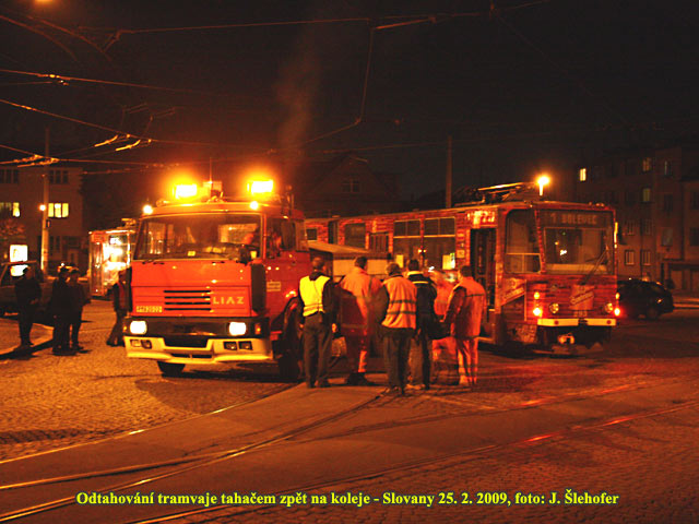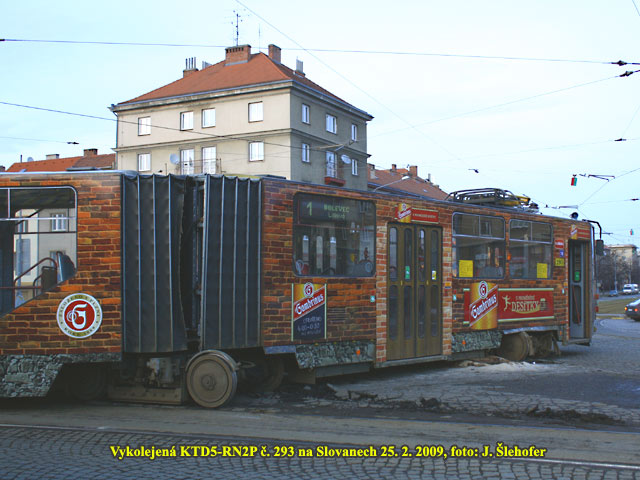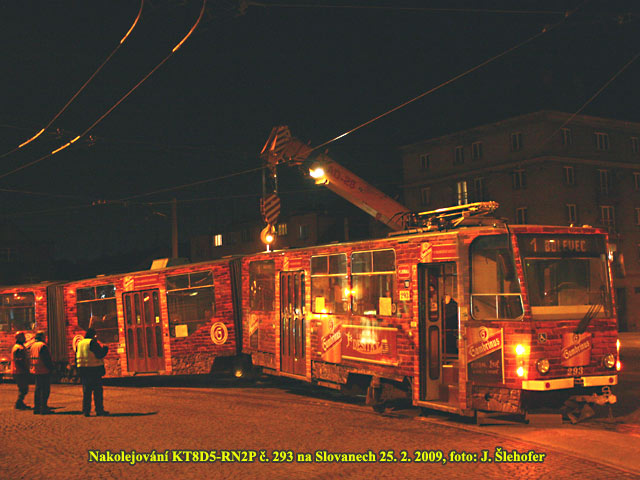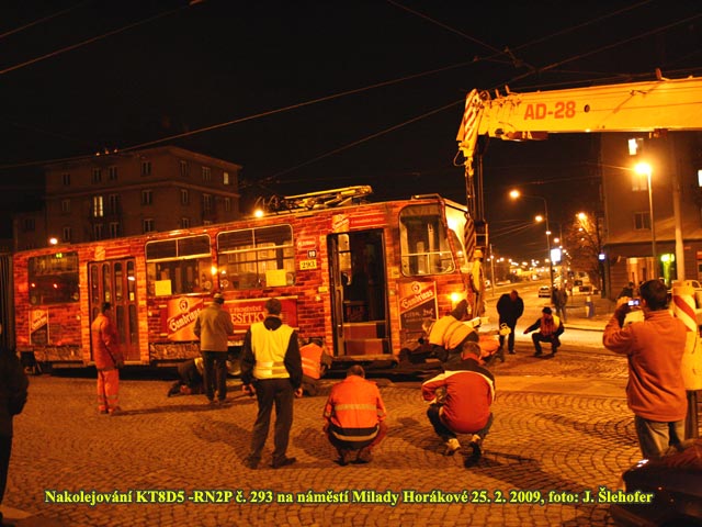 Vykolejená KT8D5-RN2P č. 293 na náměstí Milady Horákové 25. 2. 2009 Zatahování KT8D5-RN2P č. 293 zpět na koleje - náměstí Milady Horákové 25. 2. 2009 Nakolejování třetího podvozku KT8D5-RN2P č. 293 na náměstí Milady Horákové 25. 2. 2009 Nakolejování čtvrtého podvozku KT8D5-RN2P č. 293 na náměstí Milady Horákové 25. 2. 2009