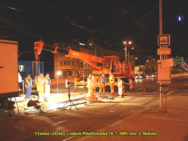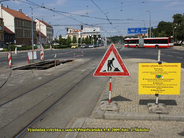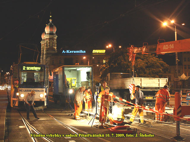Souprava 219+220 projíždí přes odkrytou vyhybku v sadech Pětatřicátníků 9. 7. 2009 KT8D5 č. 296 se v sadech Pětatřicátníků při divadelní výluce otáčí kolem právě měněné vyhybky 10. 7. 2009 Výměna vyhybky v sadech Pětatřicátníků 10. 7. 2009 Aby těch výluk nebylo málo je v pátek 10. 7. 2009 od dvaceti hodin prováděna výměna vyhybky v sadech Pětatřicátníků. Jedná se o sjízdou vyhybku ze směrů Skvrňany a Severní předměstí. Tramvaje linky č. 1 a 2 již díky divadelní výluce jezdí přes Palackého náměstí a s nimi je tudy odkloněna i linka č. 4 ve směru z Košutky na Bory.