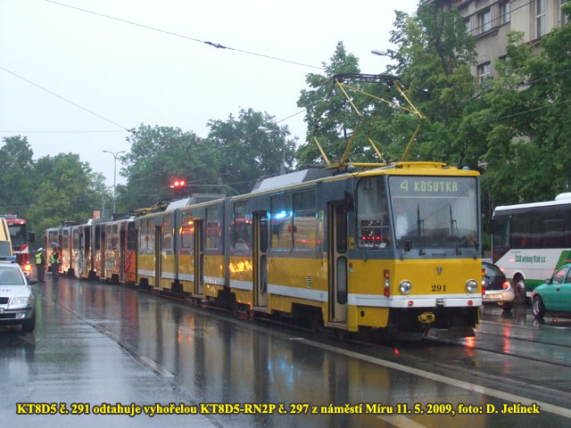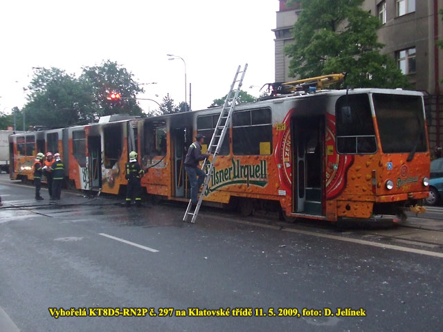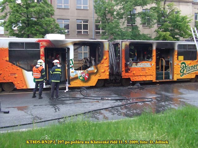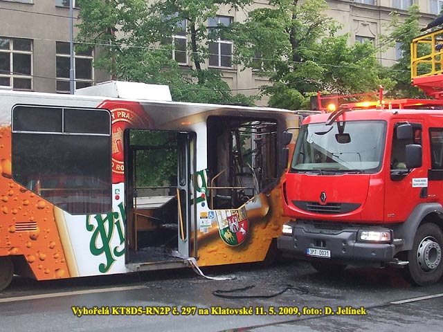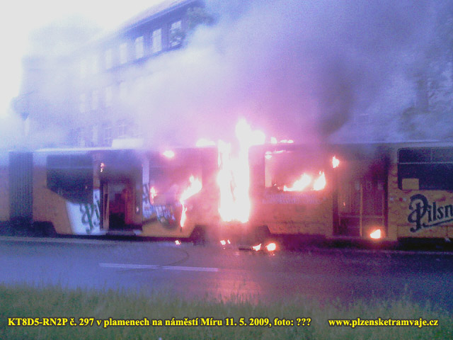 V deštivé pondělní ráno 11. 5. 2009 došlo k požáru tramvaje KT8D5-RN2P č. 297 (video zde). Nehoda se stala krátce po půl šesté za KT8D5-RN2P č. 297 v plamenech na náměstí Míru, 11. 5. 2009, autor snímku neznámý zastávkou náměstí Míru. Cestující stihli po zastavení vozu vpořádku vystoupit, ale šířící se požár vozu museli zlikvidovat až přivolaní hasiči. Příčinou je pravděpodobně zkrat na kabelech spojující články vozu, ale přesná příčina je v šetření. Při zkratu 600V došlo také k přepálení a spadnutí troleje. Vůz je nejvíce poškozen ve středním článku, avšak poškození je díky velkému žáru prakticky v celém voze.