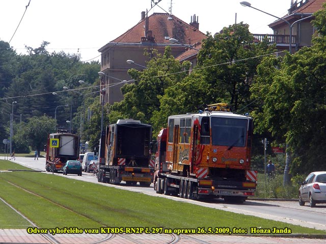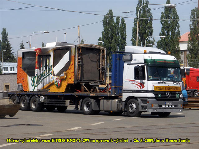 Odvoz vyhořelého vozu KT8D5-RN2P č. 297 na opravu k výrobci 26. 5. 2009, foto: H. Janda Odvoz vyhořelého vozu KT8D5-RN2P č. 297 na opravu k výrobci 26. 5. 2009, foto: H. Janda Vůz byl následně 26. 5. 2009 odvezen na opravu k dodavateli, respektive do Krnovských opraven a strojíren.