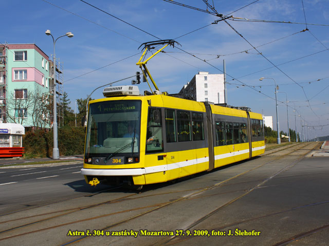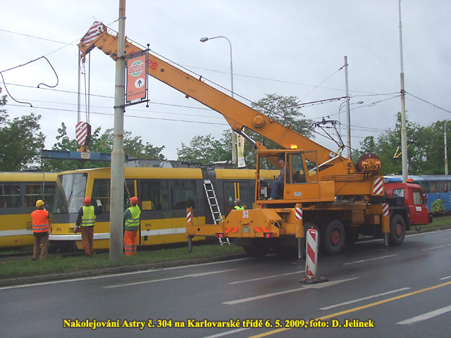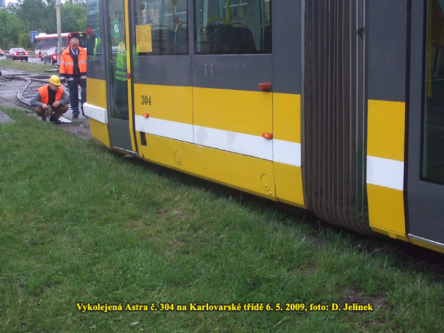 Nakolejování Astry č. 304 - 6. 5. 2009, foto: D. Jelínek Nakolejování Astry č. 304 - 6. 5. 2009, foto: D. Jelínek Kolona tramvají vzniklá po vykolejení Astry č. 304 na Karlovarské třídě 6. 5. 2009, foto: D. Jelínek Autobus náhradní dopravy přijíždí do zastávky Lékařská Fakulta, Lidická 6. 5. 2009