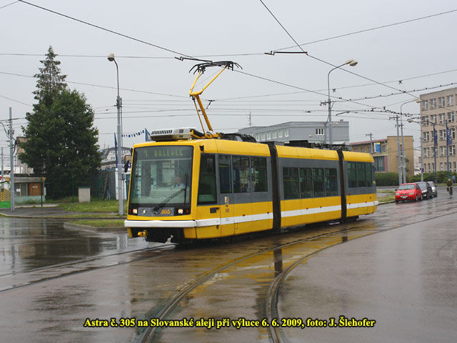 Nový vůz KT8D5-RN2P č. 298 projíždí dočasně zrušenou zastávku Pod Záhorskem 1. 6. 2009 Pohled z okna tramvaje na bagr rozebírající trať 1. 6. 2009 Souprava 198+196 sa na chvilku zastavila při problému na kaliforňanu na Karlovarské třídě 1. 6. 2009 Souprava 315+286 klesá po nové koleji Karlovarské třídě 1. 6. 2009 Astra č. 303 stoupá Karlovarskou 8. 6. 2009, foto: K. Růžička KT8D5 č. 295 stoupá Karlovarskou 8. 6. 2009, foto: K. Růžička KT8D5-RN2P č. 294 na kaliforňanu na Karlovarské 21. 6. 2009, foto: K. Růžička Souprava 258+259 projíždí dočasně zrušenou zastávkou Pod záhorskem 1. 7. 2009, foto: K. Růžička