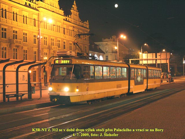 K3R-NT č. 312 při večerním křižování ve 23:05. Ne, nemá špatně nastavené transparenty, ale díky dvoum výlukám se vrací zpět přes Palackého ulici na Bory - 4. 7. 2009 K výluce při výluce pak dochází ještě při výše uvedeném víkendu (3. - 6. 7.), kdy na Bolevec a Košutku jezdí autobusy. V této večerní době pak autobusy z Košutky a Bolevec pokračují až ke Zvonu a tramvaje linky 2 ze Skvrňan a 1/4 z Bor se točí opět přes Palackého ulici.
