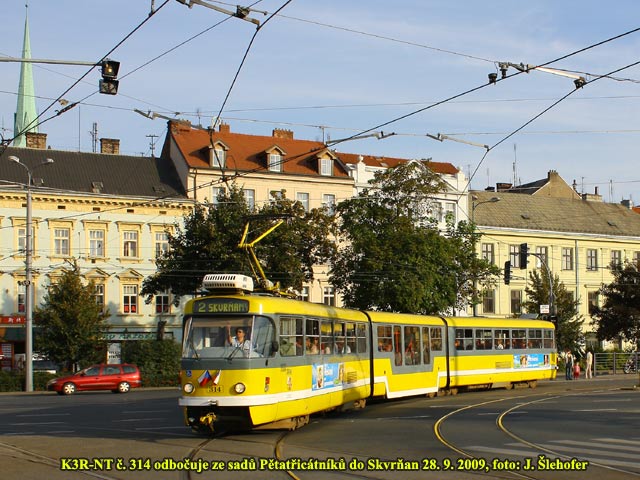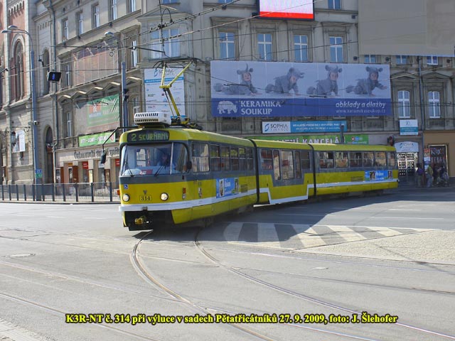 K3R-NT č. 314 přejíždí kaliforňan u zastávky Ulice Boženy Němcové 20. 9. 2009 Souprava T3M č. 221+222 projíždí jednokolejkou u křižovatky Karlovarská - Na Chmelnicích 20. 9. 2009 Citelis č. 495 projíždí kolem právě pokládaných BKV panelů na Karlovarské třídě  20. 9. 2009 Souprava 262+263 na Karlovarské třídě 27. 9. 2009