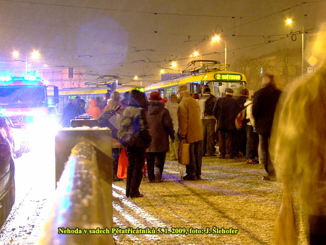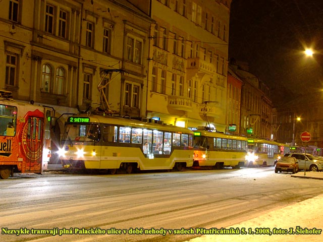 Kolona tramvají ve směru z Bor v době vypnutí trolejového vedení při nehodě v sadech Pětatřicátníků 5. 1. 2009 Vůz č. 297 odkloněné linky č. 4 zůstal stát po vypnutí trolejí na Palackého náměstí 5. 1. 2009 Palackého ulice plná tramvají v době odklonění dopravy ze sadů Pětatřicátníků 5. 1. 2009