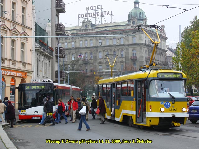 V sobotu 14. 11. 2009 probíhala výluka tramvajové dopravy na Slovany a Světovar, kam od Zvonu pokračovaly autobusy. Na lince č. 1A byly nasazeny standartní dvanácti metrové autobusy a na 2A pak kloubové Solarisy. Důvodem výluky byla výměna rozjízdné vyhybky ze Slovanské třídy do Sladkovského ulice. Vyhybka bude stejně jako na Karlovarské ovládána novým systémem Vetra. Na tramvajových torzech do Skvrňan a Bolevce byly nasazeny soupravy v intervalu deseti minut, čímž dnes nezačal na tramvajích plánovaný optimalizovaný provoz.