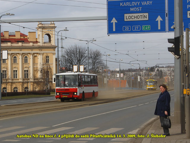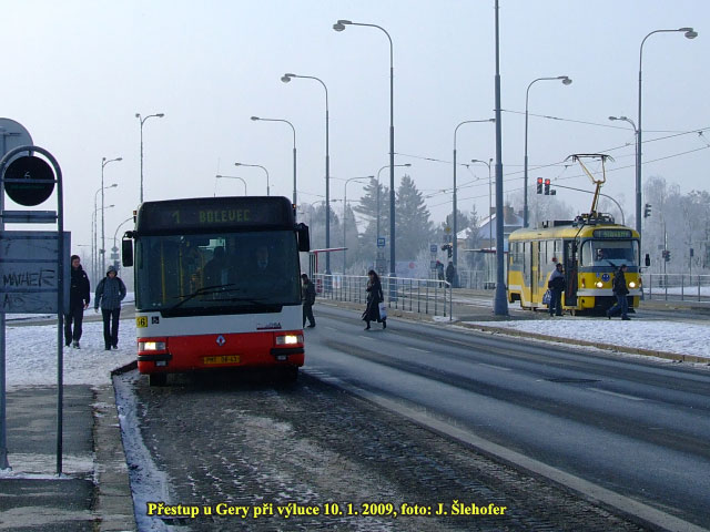 Autobus č. 410 jako náhradní doprava na lince č. 4 - 14. 3. 2009 Centrum města však bylo zatím uzavřené a tak vozy linek č. 1 a 2 jezdily z Bolevce do Skvrňan a naopak. V ulicích se objevilo i několik autobusů náhradní dopravy, které zajišťovaly operativně provoz v době zastavení tramvají a po opětovném spuštění je ještě chvíli doplňovaly. Zastavené byly neobvykle i Souprava 209+210 odstavená v Pražské ulici v době zastavení provozu - 14. 3. 2009 Citybus č. 452 v Pražské ulici v době zastavení provozu tramvají - 14. 3. 2009 tramvajové větve na Slovany a Světovar. Provoz tramvají přes náměstí byl obnoven cca v 15:15. Vozy byly v té době zajímavě namíchané a tak bylo možné např. v jednu chvíli vidět v sadech Pětatřicátníků sólo vůz linky č. 1 jedoucí od Skvrňan na Slovany a za ním přijížděla od Bolevce souprava linky č. 2 směřující na Světovar. Vozy se tedy srovnávaly ještě minimálně do šestnácti hodin.