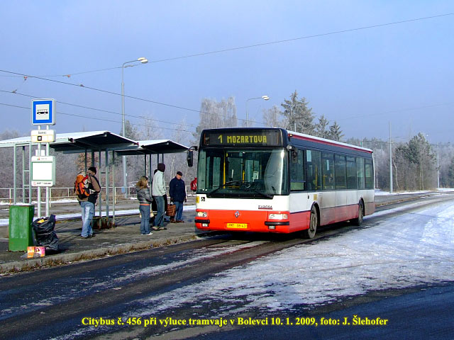 Autobusy náhradní dopravy - citybusy č. 493 a 456 na konečné v Bolevci 10. 1. 2009 Citybus č. 456 na konečné v Bolevci 10. 1. 2009 O víkendu 10 a 11. 1. 2009 probíhala výluka na tramvajové trati do Bolevce. Spoje linky č. 1 končily v obratišti Mozartova a ze zastávky U Gery, Lidická pokračovaly do Bolevce autobusy náhradní dopravy. Na tramvajových spojích linky 1 byly nasazeny sólo vozy ekvivalent T3 v jednotném Měnírna Bolevec 11. 1. 2009 intervalu deset minut. Důvodem výluky byla rekonstrukce napájení tramvajové trati v Bolevci, respetive práce na rekonstruované měnírně Bolevec. V rámci stavby je realizována rekonstrukce rozvodny 22 kV a celková výměna stejnosměrné technologie ve stávajícím objektu. Měnírna za standartního stavu napájí i část linky č. 4 na Košutce. Víkendový provoz čtyřky zajistila však měnírna Lochotín.