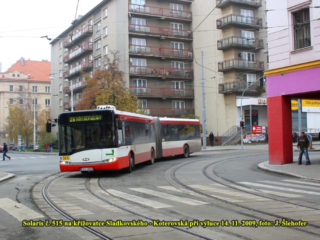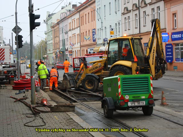 Přestup z tramvaje na autobus náhradní dopravy U Zvonu 14. 11. 2009 Autobus náhradní dopravy v zastávce Anglické nábřeží 14. 11. 2009 Solaris č. 515 při výluce na kříživatce Koterovská - Sladkovského 14. 11. 2009 Výměna vyhybky do Sladkovského ulice 14. 11. 2009