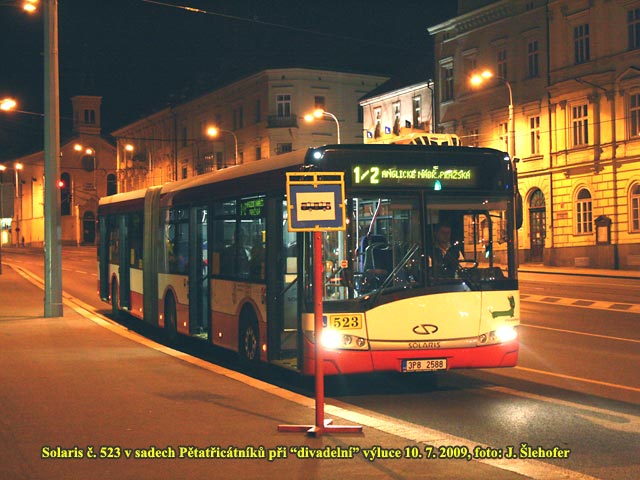 Solaris Urbino 18 č. 513 nasazený na lince č. 4 při výluce - sady Pětatřicátníků 4. 7. 2009 KT8D5-RN2P č. 288 na lince 1/4 v sadech Pětatřicátníků 4. 7. 2009 Solaris Urbino 18 č. 511 nasazený na lince č. 4 při výluce - Rondel 4. 7. 2009 Solaris Urbino 18 č. 530 nasazený na lince č. 4 při výluce - náměstí Republiky 4. 7. 2009