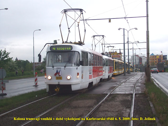 Aby toho nebylo málo, tak ještě odpoledne v cca 17:40 Nehoda dvou automobilů zastavila provoz tramvají do Skvrňan 6. 5. 2009 Kolem místa nehody projíždí K3R-NT č. 312 - 6. 5. 2009 zastavila tramvaje linky číslo dvě nehoda dvou automobilů na křižovatce před Plazou, z nichž jeden skončil v kolejišti. V tomto případě byl provoz zastaven asi jen na 20 minut, než došlo k odtažení gumokolního vozidla s kolejí.